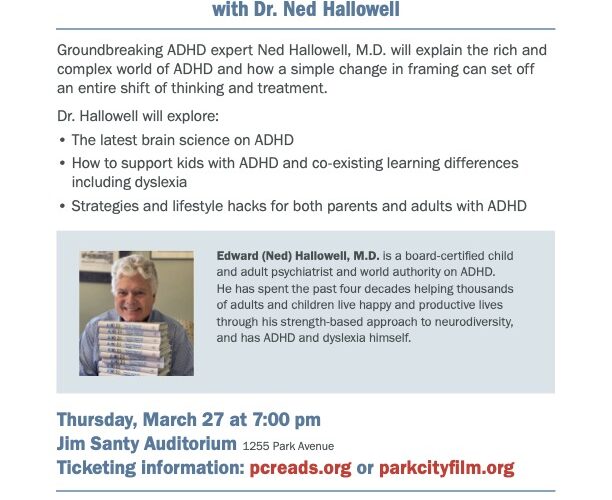 In March 2025, PC READS and community partners hosted best-selling ADHD expert Dr. Ned Hallowell for a community presentation at the Jim Santy auditorium. Dr. Hallowell has spent the past four decades helping thousands of adults and children live happy and productive lives through his strength-based approach to neurodiversity. PC READS is grateful for our community partners who sponsored Dr. Hallowell’s appearance: The Learning Center at The McGillis School, Park City Community Foundation, Park City Film, Park City Hospital, and Summit County Health.